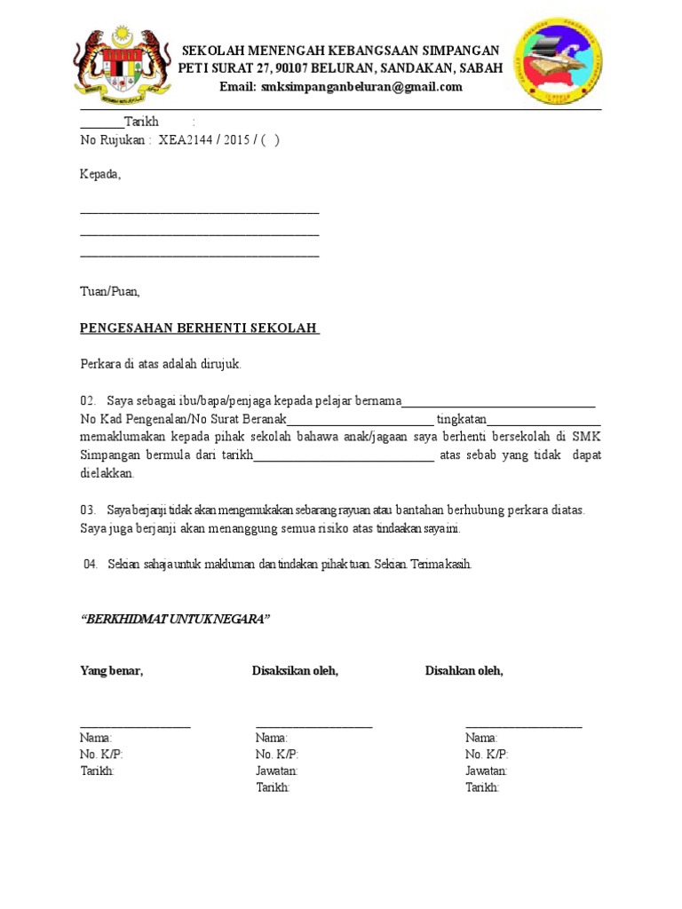 The collection that comprising. Related posts to surat rasmi berhenti tingkatan 6. Sample letter to quit school.