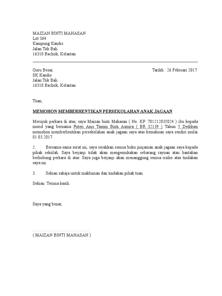 Contoh Surat Rasmi Mohon Berhenti Sekolah
